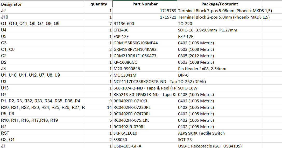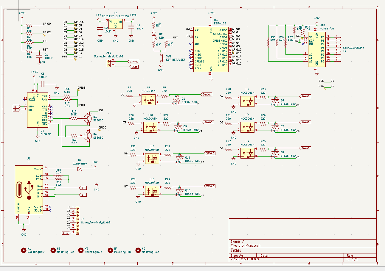 Hi, I designed recently a custom esp8266 with usb-c (used ch340c) that controls multiple triacs and optoisolators. My question is when I try uploading code into the custom pcb the output keep saying Connecting…._…. and in the end it says A fatal error occurred: Failed to connect to ESP8266: Timed out waiting for packet header. The below image is the schematic I hope someone could figure out any missing/wrong connections.