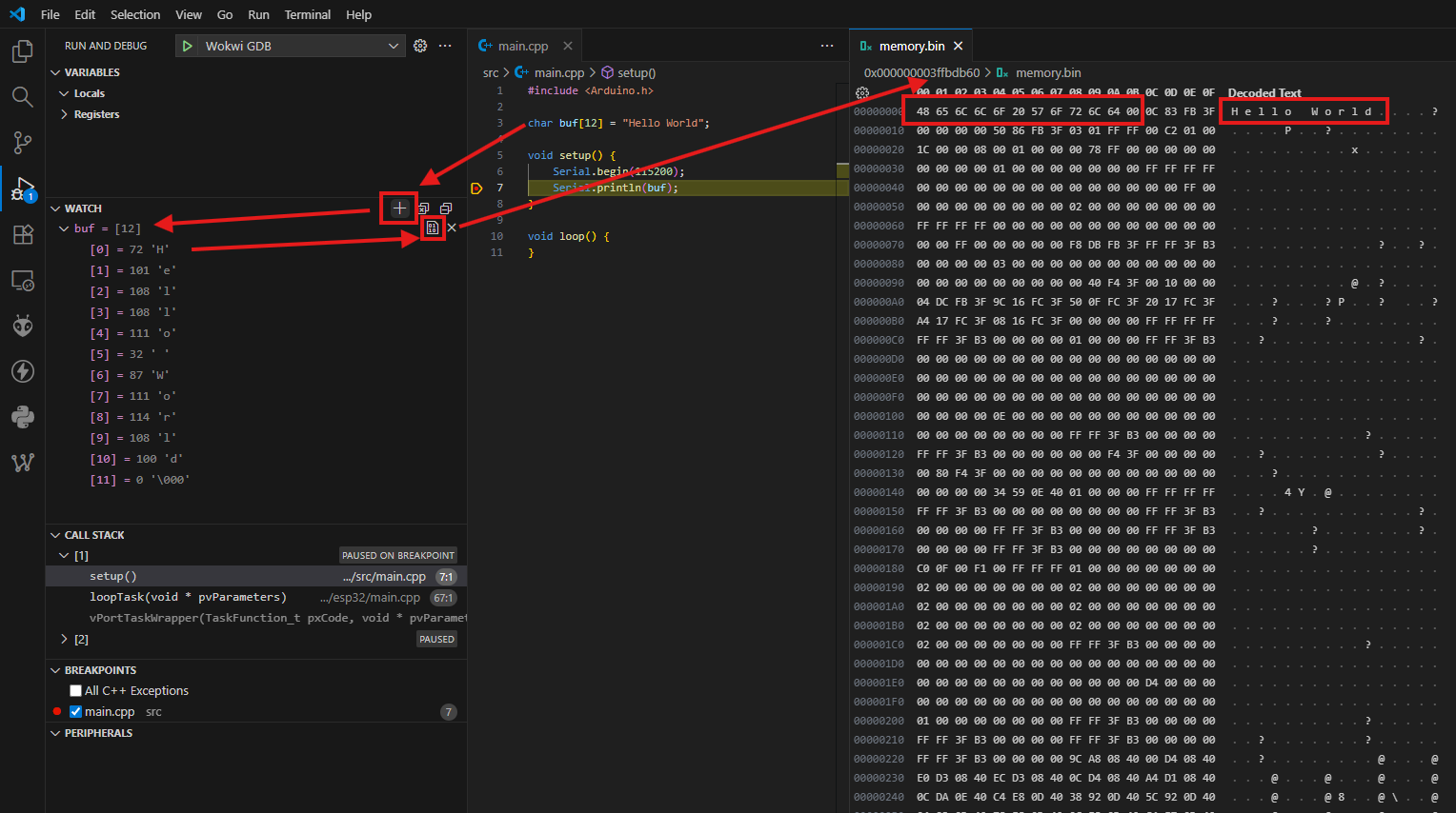 But it would be much more comfortabel if the same could be used in the field called MEMORY. It’s usually at the left hand side where also the ‘CALL STACK’, ‘BREAKPONTS’, ’VARIABLES’ ect… is show and can be set.