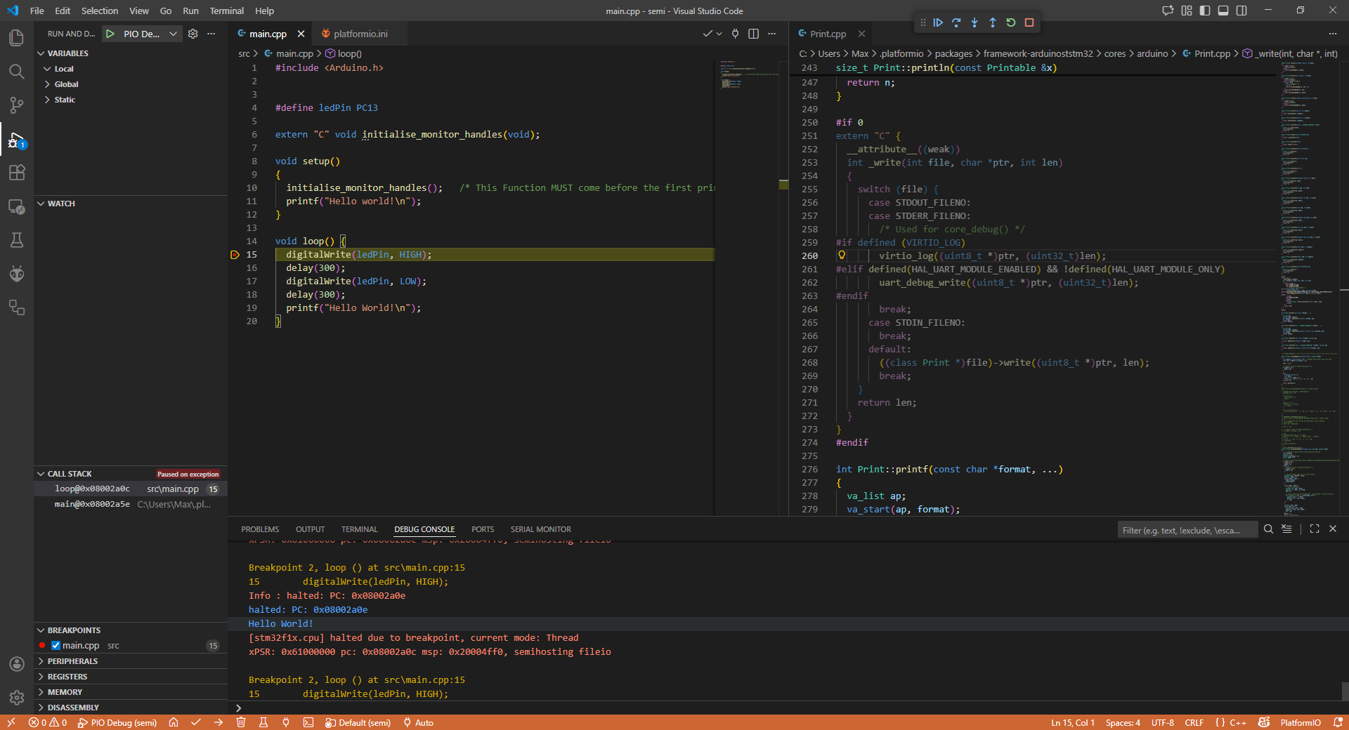 Note that since the Arduino firmware builds with --specs=nano.specs you also need the nano version of librdimon: There’s two.
