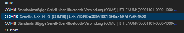 When you click the serial port selector you should see something like this: COM<X> Serial USB-Device (COM<X>) | USB VID:PID=303A:1001 SER=XX:XX:XX:XX:XX:XX