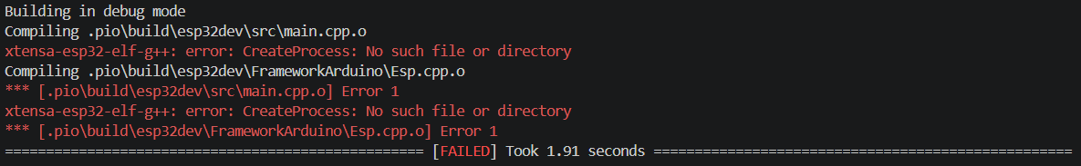 PlatformIO on Windows 11 fails to compile ESP32 projects with CreateProcess: No such file or directory, even though the toolchain exists and runs manually. All standard fixes (reinstall, PATH, permissions, shell, environment reset) have been attempted without success.