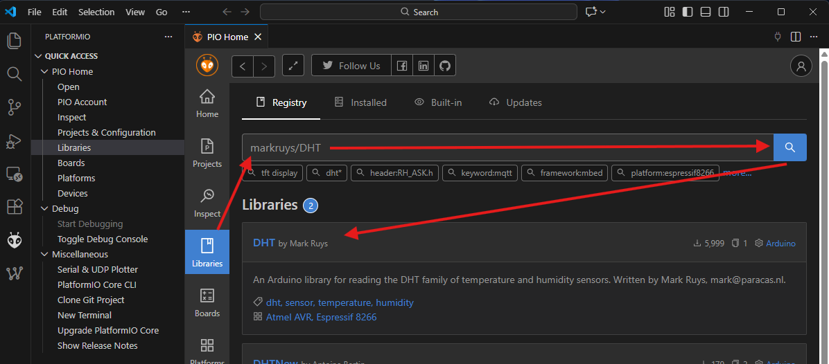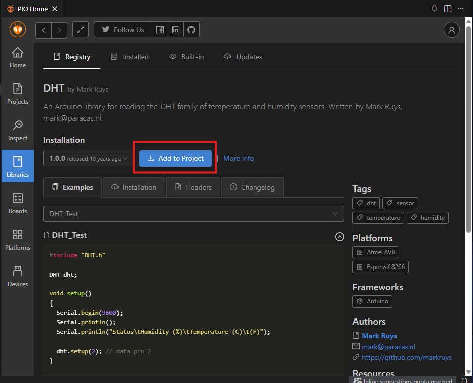 “pio pkg install -l markruys/DHT@1.0.0” -