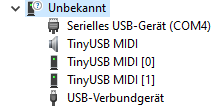 The platformio.ini below builds and uploads successfully, but the device doesn’t show up as Midi device.