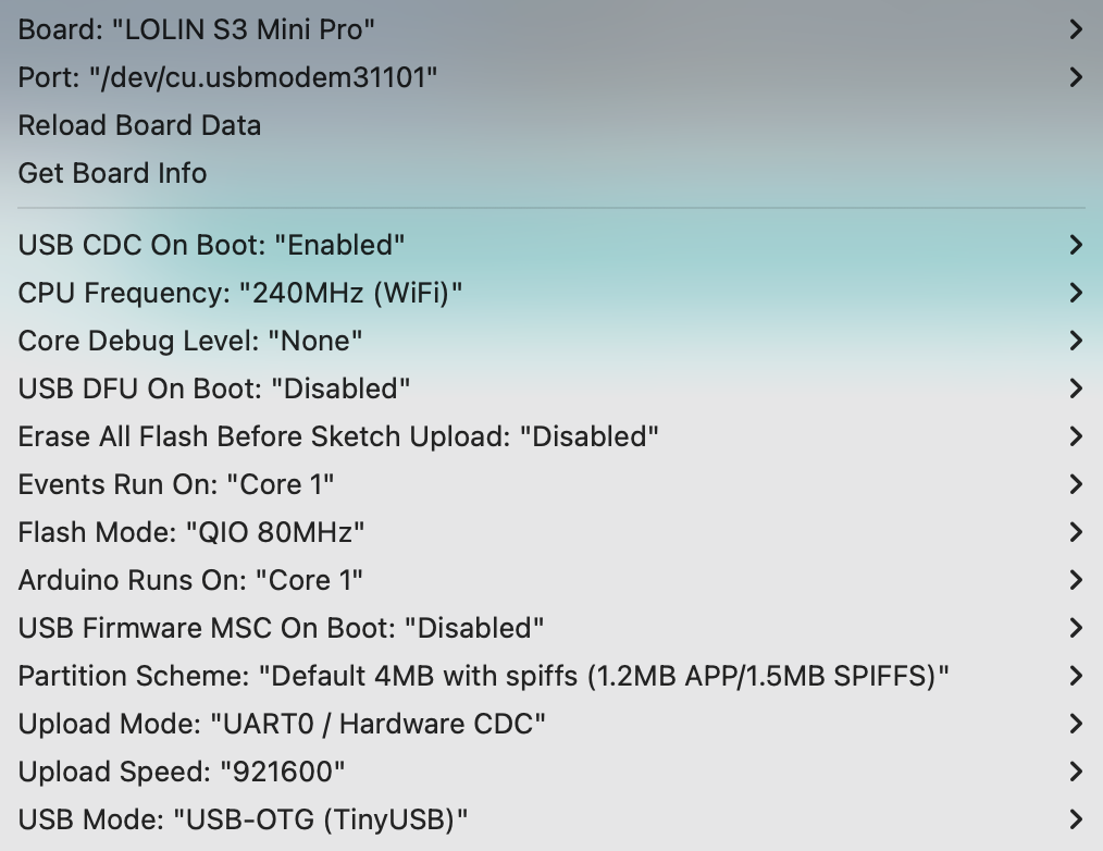 I am trying to rebuild the Adafruit Midi Test Example with PlatformIO on a Lolin S3 Mini Pro, but with no success so far. These are the Arduino IDE Params I am trying to re-create: