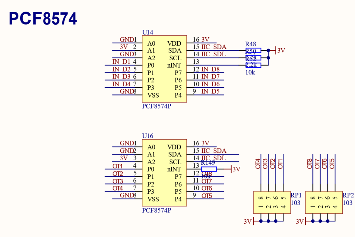 You can see that the expcted I2C address suffic of the port expanders are (A2, A1, A0) = (0,1,0) [aka 0x02) and (1,0,0). [aka 0x04]), the prefix coming from the datasheet