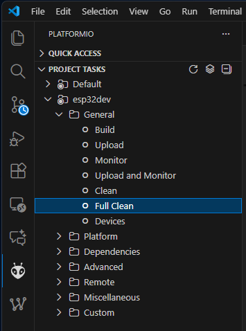 A full clean also deletes the downloaded libraries located in the .pio/build/libdeps directory of the project.