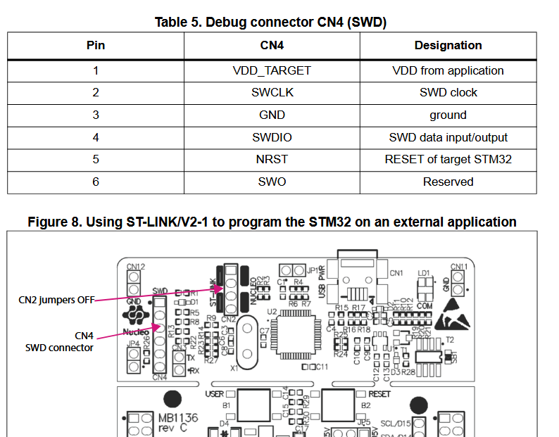 I was wondering if that might be due to reset, so I tried pushing and holding Reset (U5) button before uploading the program, but it also failed. I even tried connecting NRST (pin 5) from CN4 in Nucleo board to “STM32_NRST” pin in the E80 test board, but it failed as well.