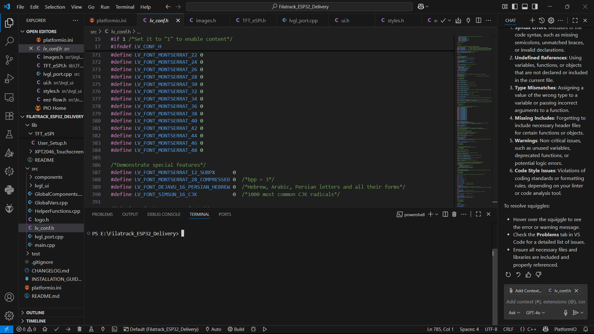 I am trying to compile the Filatrack ESP32 project, but the build keeps failing with “file not found” errors for lvgl/lvgl.h and TFT_WIDTH, even though my configuration files seem to be correct.
